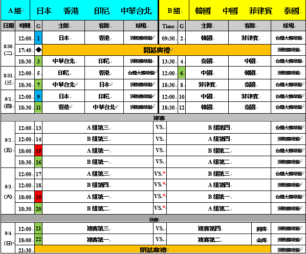 2016年第11屆亞洲U18青棒錦標賽 賽程表